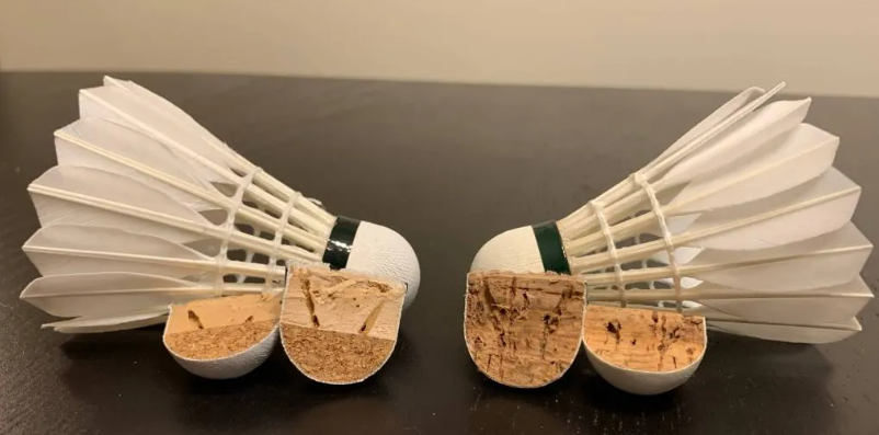 из цельной пробки (100% cork), 1 или 2 слоя - обычно у воланов высокого уровня (Li-ning G700, G800, A100+)